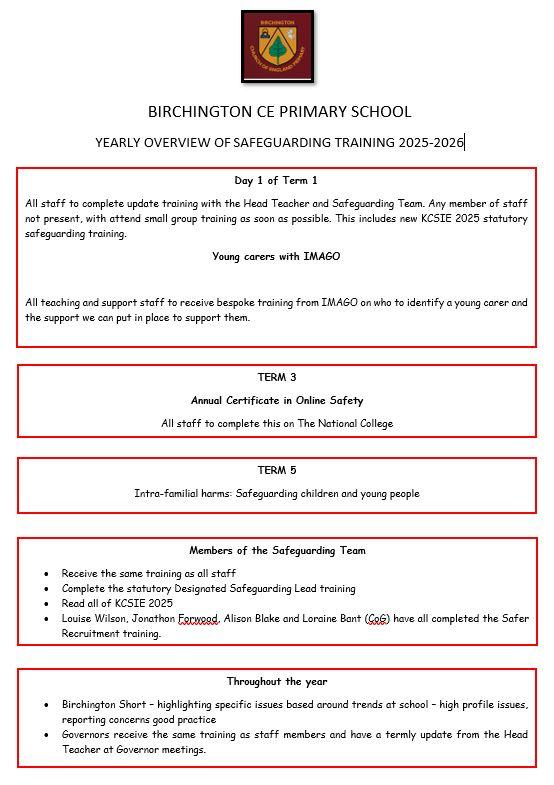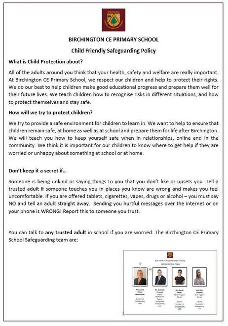 Birchington CE Primary School is committed to safeguarding and promoting the safety and welfare of young people and expects all staff, Governors and volunteers to share this commitment.